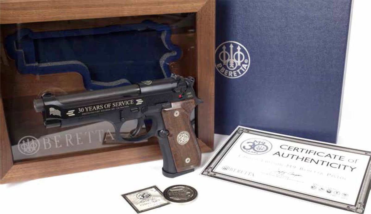 Beretta is pleased to offer the 30th Anniversary Limited Edition M9. Only 2015 of these unique collector’s edition pistols will be produced. Each of these commemorative pistols is displayed in a walnut shadow box engraved with the Beretta logo. Featured inside the shadow box is the limited edition M9 30th anniversary edition challenge coin, minted specifically for these pistols. The M9 30th anniversary limited edition pistol is silver inlayed to commemorate the 30 years of service the M9 has provided the U.S. Military.